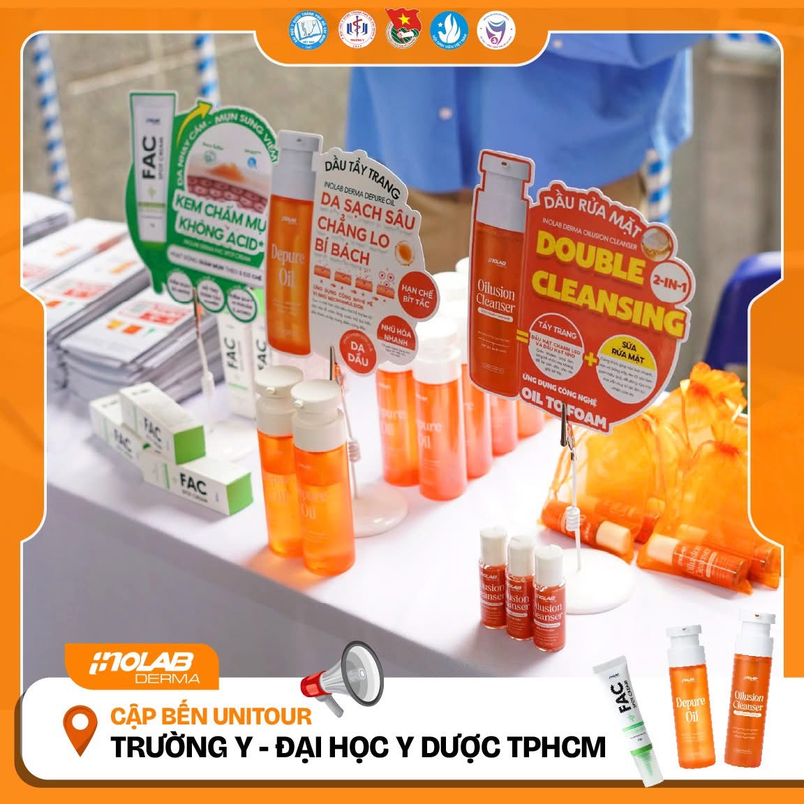 Trong khuôn khổ chương trình, các bạn sinh viên còn được giới thiệu về sản phẩm của thương hiệu chăm sóc da chuyên nghiệp Inolab Derma cùng các sản phẩm tiêu biểu như Dầu tẩy trang Inolab Derma Depure Oil, Dầu rửa mặt 2in1 Double Cleansing và Kem chấm mụn FAC Spot Cream.